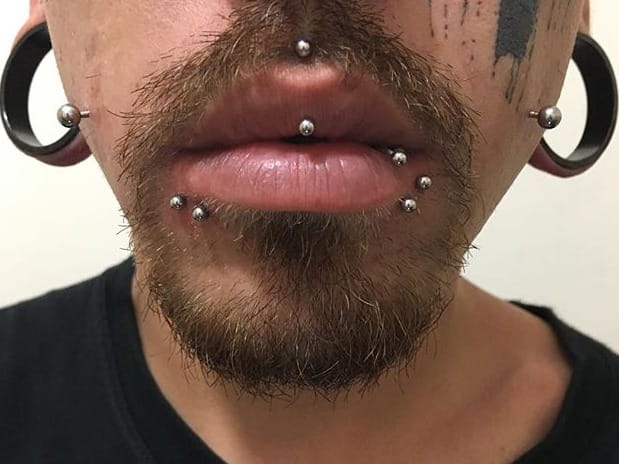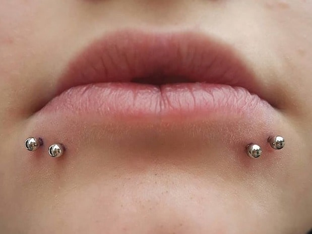Shark Bites Piercing is a combination of two perforations quite close to each other on each lower lip side. It looks incredible and evidently awesome. It is the same as Spider Bites Piercing but on each side of the lower lip. It is also similar to Snake Bites, but in Shark Bites Piercing, you get two perforations on each side. The only difference between Snake Bites and Shark Bites is the number of perforations on each side.